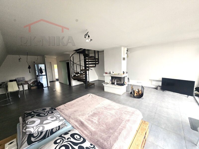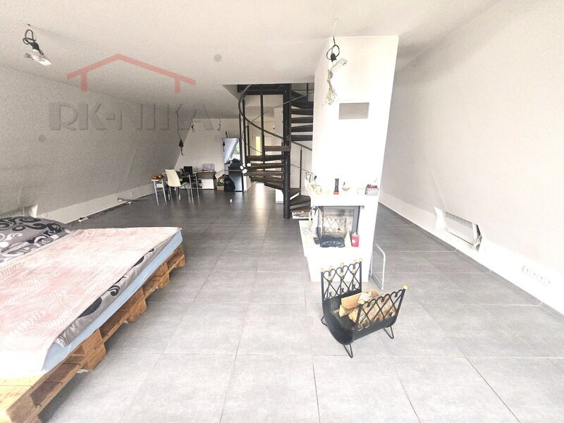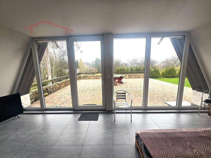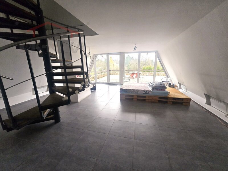 točitým schodištěm do patra. Z obývacího pokoje vedou posuvné dveře na