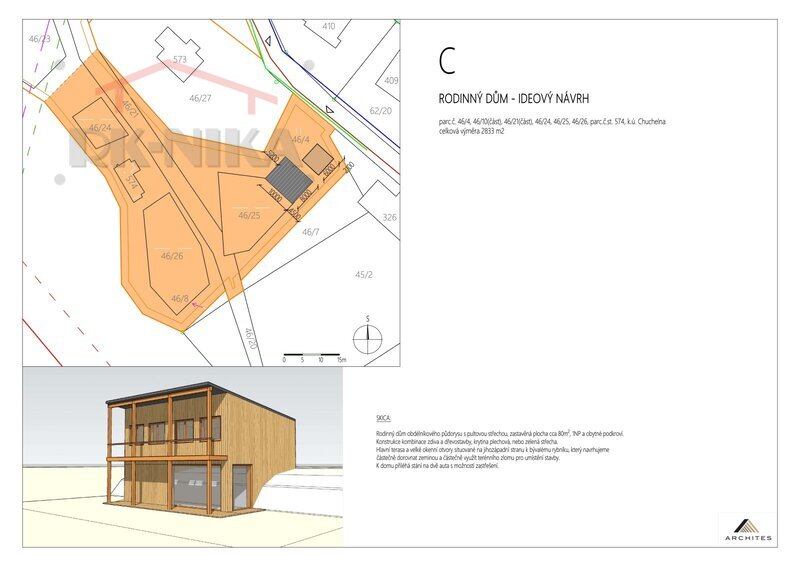 vážnému zájemci. Upozornění: plocha označená ve studii jako „dům A“
